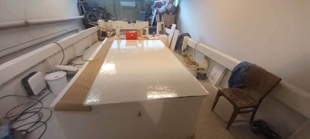 Berið topcoat eða gelcoat á plötuna, látið harðna en ekki um of, ég læt ekki meira en 6 klst líða þar til ég byrja að setja mottur og resin. Þannig næst “efnisleg binding” og óþarfi að pússa og/eða grunna fyrir plöstun. Ekki byrja of snemma, þá er hætt við að motturnar nái í gegn og svokallað “Crocodile skin” myndist á yfirborðinu.