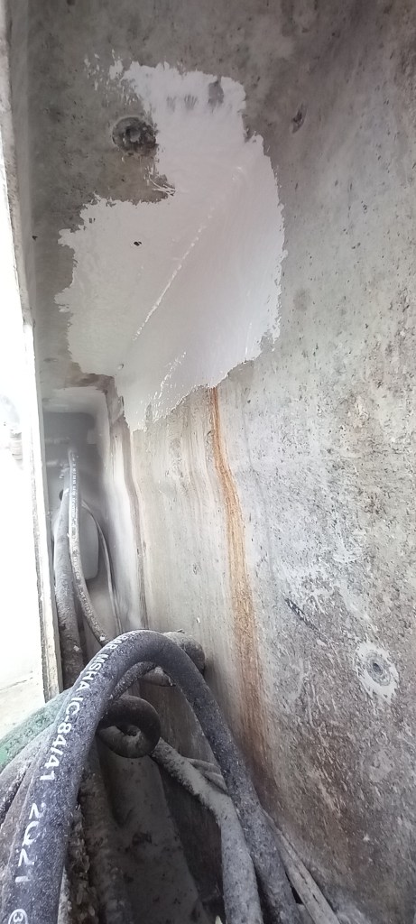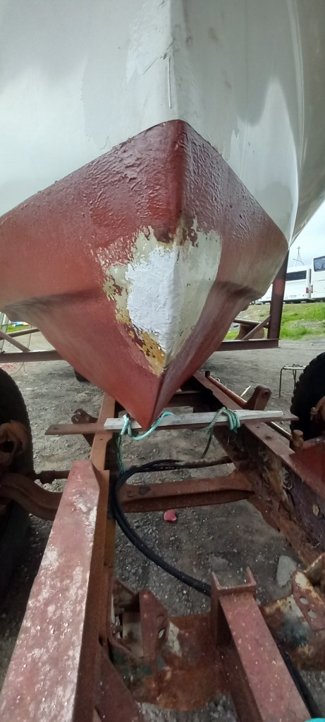 Eigendurnir, sem er annt um bátinn sinn, vildu líka laga smá brot framan á stefni bátsins, líklega eftir árekstur við rekald eða álíka. það var plastað og málað með topcoat og svo með botnmálningu.