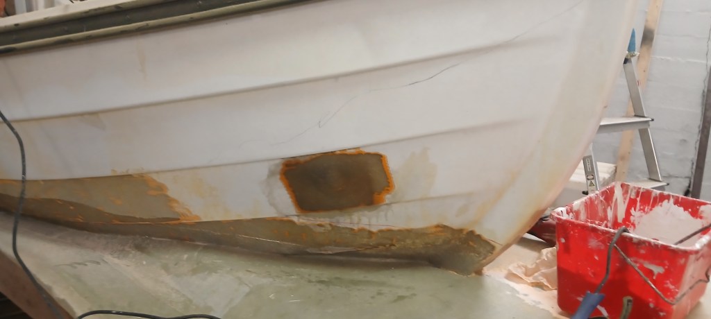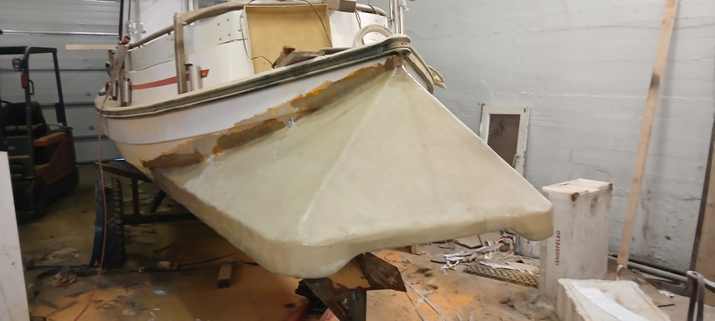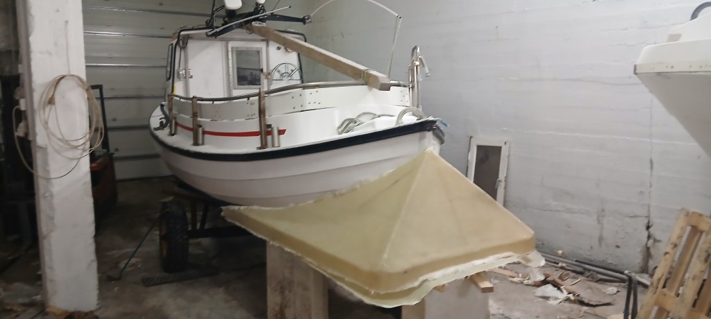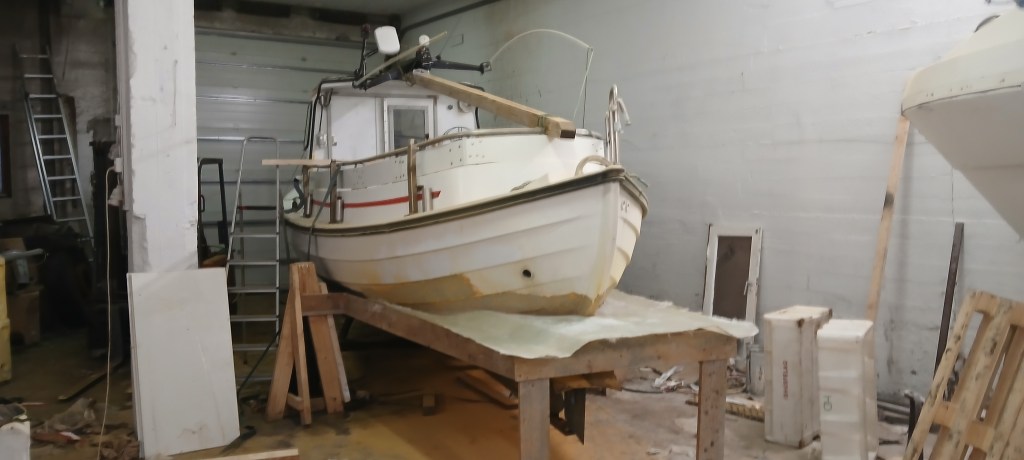 Þar sem kassinn er ekki ætlaður á þennan skrokk þurfti að ákveða botnlínuna og þar var kassinn engin hjálp. Smiðað var borð undir bátinn þegar búið var að stilla hann af. Þannig var auðvelt að renna kassanum frá til að skera af honum og svo slípa bátinn þar sem kassinn var plastaður á hann.